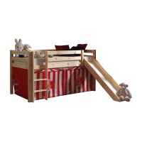 Gør børneværelset til et sjovt og trygt sted at være med Pino halvhøj seng i natur. Sengen kombinerer leg og søvn i ét møbel: barnet kan starte dagen på den glatte rutsjebane og have sin egen hyggelige hule bag det farverige CHUCKY forhæng med røde og hvide striber og glade klovnemotiver. Den naturlakerede overflade passer smukt ind i skandinaviske børneværelser.