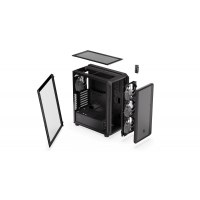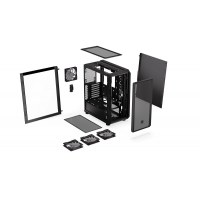 Kabinettet understøtter bundkort i ATX, micro ATX og Mini-ITX og har plads til grafikkort op til 35 cm og CPU-kølere op til 17,9 cm. Der er syv udvidelsespladser, seks 2,5"-båse og én kombi-bås til 2,5"/3,5" lager. Et aftageligt støvfilter hjælper med at holde indmaden ren, og frontpanelet byder på USB-C, to USB-A samt lyd ind/ud – så dine vigtigste porte er lige ved hånden.