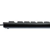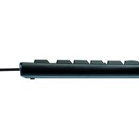 Det slanke tastatur har en buet mellemrumstast for en mere naturlig skriveposition. De tydelige, hvide tegn er nemme at aflæse, og de robuste, justerbare ben kan øge hældningen med 8 grader. Designet er stænktæt for ekstra tryghed i hverdagen.