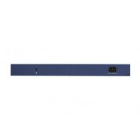 GS724TP er rackmonterbar i 19" rack, har LED‑indikatorer for link, hastighed og aktivitet samt tre blæsere til køling. Kabinettet er blåt og kompakt (H × B × D: 4,3 × 44,0 × 20,4 cm) med en vægt på 3,7 kg.