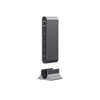 Docken byder på HDMI x 2, DisplayPort, flere USB-porte (USB 2.0, USB 3.2, USB‑A 3.2 samt USB‑C 3.2 Gen 2), RJ45 samt 3,5 mm jack. Den er markeret som kompatibel med Windows og har en konstruktion, der er forstærket med ståltråd for ekstra robusthed. Med “onesize” passer den nemt ind på enhver arbejdsplads og gør kabelrodet mindre.