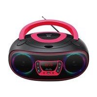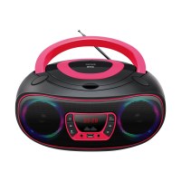 DENVER TCL-212BT er en smart og transportabel boombox i sort/pink, der gør det nemt at høre musik fra flere kilder. Lyt til CD’er, Bluetooth-streaming eller FM-radio, og nyd stereolyd fra de indbyggede højttalere. De farverige LED-lys omkring højttalerne giver et levende udtryk, som passer perfekt til børneværelset, køkkenet eller en lille fest.