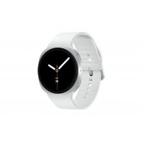 Uret kombinerer en let urkasse i aluminium med safirglas på bagsiden og en stilren hvid rem med sølvfarvet spænde. Tynd profil på 8,6 mm og en vægt på kun 34 g gør det behageligt hele dagen. Det er IP68-klassificeret og 5 ATM vandtæt. Under motorhjelmen finder du Exynos W1000-processor, 2 GB RAM og 32 GB lager til apps, musik og træningsdata. Indbyggede højttalere og mikrofon understøtter opkald og Bixby stemmestyring.