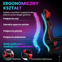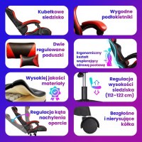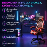 Stolen har justerbar sædehøjde og mulighed for at regulere ryglænets vinkel. Der medfølger to justerbare puder til nakke og lænd, så du kan støtte kroppen efter behov. Sædet kan rotere 360°, og understellet er udstyret med hjul for nem bevægelse ved skrivebordet. De markante sorte og røde paneler giver et sporty look, der passer ind i ethvert gaming-setup.
