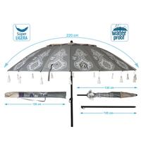 Skærmen er prydet med dekorative boho-motiver i hvid på grå baggrund og passer flot ind i moderne udemiljøer. Dugen giver SPF50+ beskyttelse og hjælper med at skærme mod solens stråler, så du kan nyde udendørslivet længere.