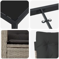 - Materialer: Havesættet er lavet af en smart blanding af polyrattan, stål og glas. Polyrattan ser flot ud og kan klare vejret, mens stål sørger for stabilitet, og glasoverfladen er elegant og nem at rengøre. Denne kombination gør, at sætningen vil holde i mange år og ser godt ud, uanset om det regner eller er solskin.