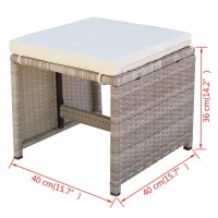 Det pulverlakerede stålstel gør bordet, stolene og taburetterne robuste og slidstærke, og møblerne er lette at flytte rundt takket være deres lette konstruktion. Det vejrbestandige og vandtætte polyrattan gør spisebordssættet nemt at rengøre. Glasbordpladen er også nem at rengøre med en fugtig klud.