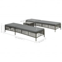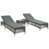 Dette møbelsæt er nemt at rengøre, slidstærkt og egnet til daglig brug takket være det vandafvisende polyrattan. Liggestolene har robuste, pulverlakerede stålstel, hvilket gør dem særdeles stabile og holdbare. Ryglænene kan justeres for den mest behagelige stilling. Du kan holde dine drinks, telefoner, bøger eller andre småting inden for rækkevidde på det robuste, firkantede bord. De tyktpolstrede, aftagelige hynder føjer til deres sidde- og liggekomfort. Polyesterbetrækkene kræver kun lav vedligeholdelse og kan tages af og vaskes. Pakken indeholder 2 liggestole, 1 lille bord og 2 store sædehynder.