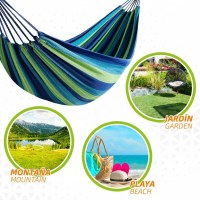 Hængekøjen har friske striber i blå og grønne nuancer, der giver et sommerligt udtryk. Liggefladen måler ca. 200 × 100 cm, og den maksimalt understøttede vægt er 200 kg. Der medfølger snore til ophæng, så du kan komme hurtigt i gang med at nyde din fritid.