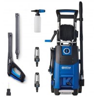 Maskinen har integreret slangerulle, vandfilter og sæbebeholder, så du nemt holder styr på udstyret og kan skifte mellem vand og skum. Pumpen er i messing for solid drift, og IPX5-beskyttelse samt automatisk sluk hjælper med sikker betjening. Der medfølger justerbar dyse, lanse og skumlanse – samt nål til rensning af dyser – så du kan tilpasse strålen fra skånsom til kraftig. Slangelængde: 15 m (ekstra 5 m mulighed ifølge data).