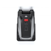 GOAT O600 RTK kan betjenes via smartphone/tablet og har tydelig STOP-knap for sikker håndtering. Den leveres i en elegant sort/grå finish, vejer 10,4 kg og har en kompakt ladestation, der er nem at placere i haven.