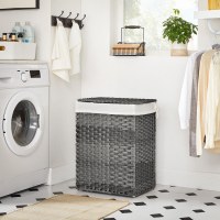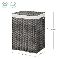 Hold soveværelse eller badeværelse ryddeligt med denne smukt håndflettede vasketøjskurv i grå. Den store kapacitet på 90 l skjuler nemt snavset tøj og giver et stilrent udtryk i hjemmet. Den robuste, vandafvisende syntetiske rattan og den stabile metalramme gør kurven velegnet selv i fugtige badeværelser.