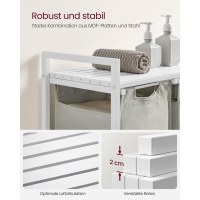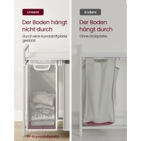 De tre poser kan trækkes ud og tages helt af via praktiske hook-and-loop-lukninger, så du let kan bære dem til vaskemaskinen. Hver pose har en plastbund, der modvirker hæng og holder formen. Konstruktionen er stabil med stålramme i 2 cm rør og MDF-top, som kan bære op til 20 kg. Justerbare fødder giver sikkert fodfæste på ujævne gulve. Poserne er lavet af vandafvisende Oxford-stof.