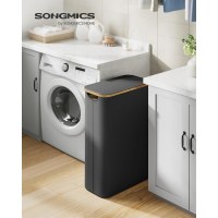 Hold styr på vasketøjet uden at fylde. Denne slanke vasketøjskurv på 65 l måler 42 × 22,5 × 70,5 cm og glider ind i smalle nicher i badeværelset eller vaskerummet. Låget skjuler rodet og holder støv ude, mens det diskrete logo fungerer som praktisk håndtag for nem åbning.
