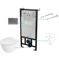 Sættet omfatter installationsramme med skjult cisterne, skylleknap, væghængt toiletskål og nødvendige monteringsdele.