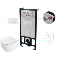 Sættet omfatter en installationsramme med cisterne, betjeningspanel med to knapper, væghængt toiletskål og monteringsdele.