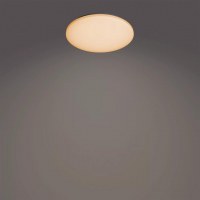 Plafonden er 47 cm i diameter og kun 7 cm høj, hvilket giver et slankt, nutidigt udtryk i hvide nuancer. Den monteres på overfladen og er beregnet til indendørs brug (IP20). Den medfølgende fjernbetjening gør det let at dæmpe lyset og skifte farvetemperatur, så rummet altid får det rette lys. Den integrerede LED på 40 W har en levetid på op til 20.000 timer og en lysvirkningsgrad på 107 lm/W.