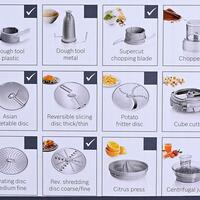 Foodprocessoren leveres med en bred pakke af tilbehør: skål og låg, universal-kniv, ælte- og dejværktøj, piskeris, blendersæt, skive til skæring samt rive- og hakkeindsatse. Den skridsikre fod sørger for stabilitet, mens drejeknappen gør betjeningen enkel. Designet i sort og rustfrit stål passer stilrent ind i de fleste køkkener.