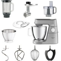 Køkkenmaskinen leveres med to rustfri stålskåle på 7 l og 5 l samt K-beater, dejkrog og ballonpiskeris i rustfrit stål. Du får desuden blenderkande-tilslutning, chopper- og kødhakkertilbehør, flexi-piskeris, stænkskærm og spatel. Aftagelige dele tåler maskinopvask, så rengøringen er hurtig. Med 1.200 W motor og elektronisk styring er det en pålidelig hjælper til både store og små portioner.