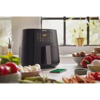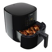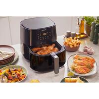 Gør hverdagsmad nemmere med Airfryer XL til hele familien. Med en volumen på 6,2 liter og fødevarekapacitet på 1,2 kg kan du tilberede lækre måltider til op til 5 personer. Den digitale berøringsskærm med LED-display gør det enkelt at vælge temperatur og programmer, mens automatisk sluk og Cool Touch-kabinet giver tryg betjening i køkkenet. Hold maden varm, genopvarm rester, bag, grill og steg – alt i én kompakt varmluftsrister i mørk sølv/sort.