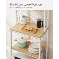 Få styr på køkkenet og frigør bordpladsen med denne alsidige køkkenreol. Reolen rummer 6 hylder til alt fra service og tørvarer til småapparater, og de medfølgende 6 S-kroge holder redskaber lige ved hånden. Den kombinerer egetræsfarvede hylder og hvid stålramme i et let industrielt look, der passer perfekt i moderne hjem eller som lille kaffebar.
