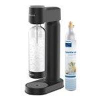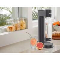 Maskinen har mekanisk trykknap og kræver ingen strøm. Den leveres med en PET-flaske på 1 l og en CO₂-gascylinder (60 l), så du kan komme i gang med det samme. Konstruktionen er i plastik og er BPA-fri. Den slanke, mørkegrå enhed passer diskret ind på køkkenbordet.