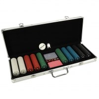Indhold: Jetoner x500, kortspil x2, terninger x5, nøgler x2, kuffert. Jeton diameter: 4 cm. Emballage: 60 × 27 × 10 cm. Læs brugsvejledningen før brug. Kun til underholdning – ikke til pengespil. Holdes væk fra små børn på grund af små dele.