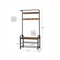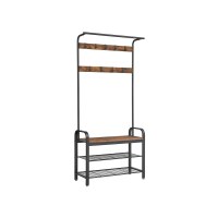 Den stabile stålramme med 3,8 cm brede ben og bordplader i spånplade skaber en solid konstruktion, hvor bænken kan bære op til 90 kg – perfekt når du vil sidde behageligt og skifte sko. De 9 aftagelige kroge i to rækker giver fleksibel ophængning af små og store ting. Det industrielle udtryk i rustik brun og sort passer flot i entre, gang eller bryggers.