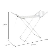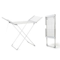 Få tøjet tørt - også på kolde eller fugtige dage. Det sammenklappelige **elektriske tørrestativ med vinger** fra InnovaGoods giver dig 20 opvarmede stænger, justerbar temperatur 35-60 °C og praktisk touchpanel med digital visning. Vælg selv tid og varme via timeren op til 12 timer, og lad tøjet tørre hurtigt og skånsomt. Den lette aluminiumsramme i X-design står stabilt og kan bære op til 15 kg.