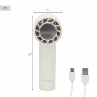 Ventilatoren er fremstillet i ABS og måler ca. 6 × 17 × 8,5 cm - nem at have i tasken eller skuffen. Den leveres med batteri, så du kan tage den i brug med det samme. Et enkelt tryk på knappen aktiverer luftstrømmen, og det minimalistiske, lyse design passer ind de fleste steder.