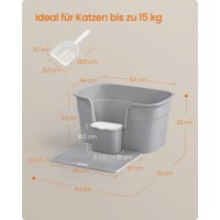 Denne ekstra store kattebakke giver masser af plads til store katte til at vende sig og grave i ro. Med målene 64 × 44 × 33 cm er den velegnet til katte op til 15 kg – ideel til fx Ragdoll og Maine Coon. De høje sider giver din kat lidt privatliv og hjælper med at holde grus og urin inde, så hjemmet forbliver pænt.