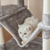 Giv dine indekatte deres eget univers med dette 206 cm høje kattetræ i lysegrå. De 5 niveauer med kun 30–40 cm mellem afsatserne gør det nemt at klatre op og ned – perfekt til nysgerrige klatrere, der elsker højder. Med 2 bløde udkigsplatforme, 2 hyggelige huler, en fluffy kurv, hængekøje og pomponer er der altid et sted at slappe af, lege og holde øje med hjemmet.