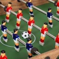 Med en størrelse på 121 × 81 × 61 cm får du et bord i en praktisk hjemmestørrelse, der stadig føles autentisk at spille på. Konstruktionen i træ, metal og plastik giver en solid og stabil oplevelse. Ved hver ende sidder en simpel måltæller, og bolden kan nemt hentes via udtag i siden.