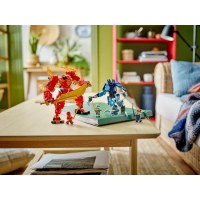 - NINJAGO mech-duel med rød ild-mech og blå modstander