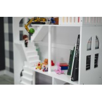 Giv bøger og legetøj et stort og charmerende hjem. Denne 2‑i‑1 bogreol i form af et hus passer perfekt ind i ethvert børneværelse og fungerer både som møbel og dukkehus. De tre etager med åbne rum og trapper indbyder til leg og gør det let at holde orden og skabe en hyggelig indretning.