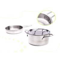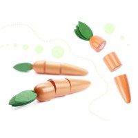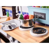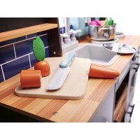 Det omfattende sæt inkluderer metalpande, gryde med låg, øse, spatel, hulske, trækniv og skærebræt. De medfølgende gulerødder og radiser i træ kan “skæres” i skiver og samles igen med velcro – et hit, der træner finmotorik og giver masser af kreativ leg. Køkkenet har også to stoforganisatorer, der ligner skuffer, samt døre der lukkes med magneter.