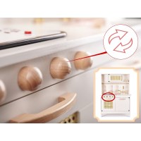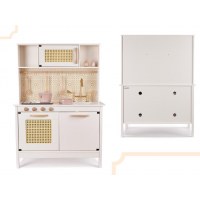 De mange håndtag, knapper og låger træner barnets finmotorik og rumforståelse, mens rollelegen styrker sprog og samarbejde. Det vendbare bagpanel lader dig skifte udtryk mellem ensfarvet creme og mønstret tapet, så køkkenet altid matcher indretningen.