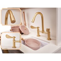 Køkkenet har dyb vask med tap og drejeknapper, ovn med fletmønsterfront, ekstra skab, hylder og en stang med kroge til redskaber. Den medfølgende gryde med låg, pande, ske, si-ske, spartel samt salt- og peberbøsser gør legen komplet. Den aftagelige gasplade giver realistiske lys- og lydeffekter ved tryk på knapperne (kræver 2 × AAA, medfølger ikke).