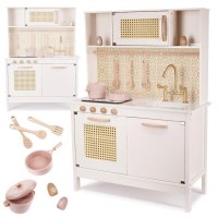 Giv barnet et smukt og funktionelt legekøkken i træ, der inviterer til timer med fantasifuld madlavning. Sættet rummer køkken med ovn, vask og haner, kogeplader med lys- og lydeffekter samt masser af tilbehør. Det retroinspirerede design i hvid, guld og pudderrosa passer elegant ind på børneværelset og i stuen – perfekt til rolleleg alene eller sammen med søskende og venner.