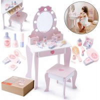 Skab hyggelige stunder med et sødt sminkebord i træ, der inviterer til fantasifuld leg. Sættet kommer med et ovalt spejl omgivet af runde lyspunkter og en lille taburet, så barnet kan sidde godt, mens der leges. Bordpladen har små opbevaringsrum og en skuffe, så alle små accessories kan holdes samlet. De bløde rosa nuancer, hjerte-detaljer og fine sløjfer giver et indbydende udtryk, som passer perfekt på børneværelset.