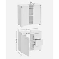 Skab ro og orden på badeværelset med dette stilrene skab i hvid. Med 3 store skuffer i siden og 2 praktiske rum bag lågen får du masser af plads til håndklæder, toiletartikler og hverdagens småting. De solide ben løfter skabet fra gulvet og beskytter mod vandstænk, mens den glatte overflade er nem at holde ren med en klud.