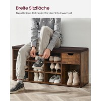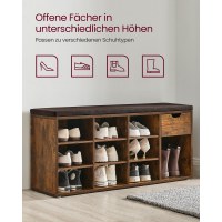 Reolen kombinerer et polstret sæde med åbne rum i flere størrelser og et smart skuffedesign. Et større fag giver plads til støvler, mens de mindre rum passer til alt fra sneakers til opbevaringskasser. Sædebetrækket kan tages af for nem rengøring, og de medfølgende, markerede dele gør samlingen ligetil.