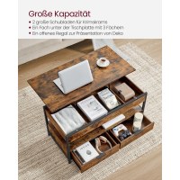 Den stabile løftemekanisme med kvalitetsbeslag og forstærkede tværstænger giver en jævn bevægelse, og den hævede bordplade kan bære op til 20 kg. Den robuste konstruktion i spånplade og stålramme er lavet til daglig brug og kan samlet bære op til 136 kg. De sorte ben og de rustikbrune paneler skaber et industrielt look, der løfter indretningen og tilfører stuen en varm, vintage stemning.