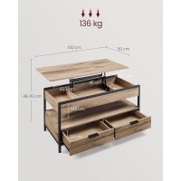 Hold ro og orden i stuen. Den store bordplade og hylden under giver åben plads til det, du bruger mest. Tre skjulte rum under låget og to skuffer hjælper med at holde tæpper, magasiner og småting væk fra synet – men altid inden for rækkevidde. Takket være kvalitetsmetalhængsler og forstærkede tværstænger løfter toppen jævnt og kan bære op til 20 kg i hævet position.