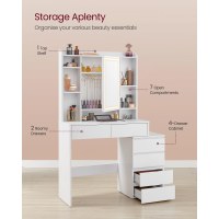 Bordet giver dig overblik med bordplade, 7 åbne rum, 2 store skuffer, kroge og 2 hylder bag spejlet samt et side-skab med 4 skuffer. De venstre 2 hylder og den midterste hylde til højre kan justeres i 3 niveauer, så både små og høje produkter finder plads.