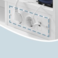 Bordet rummer 9 rummelige skuffer samt fleksible hylder, så du kan holde alting på sin faste plads. Monteringen af skuffeskinner klares hurtigt med et smart kliksystem – ingen værktøj eller skruer behøves. En integreret multi-stikdåse i siden giver praktisk adgang til strøm til hårstyling eller opladning.