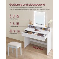 Skab din egen makeup-zone med dette moderne toiletbord i hvid. De 9 LED-pærer med justerbar lysstyrke gør det let at finde den rette belysning til præcis makeup – hold bare kontakten nede for at dæmpe eller øge lyset. Et stort spejl og en bred bordplade giver et klart overblik, så din daglige rutine bliver både hurtigere og mere behagelig.