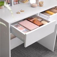 Det lyse, rene udtryk skaber en indbydende plads, der giver lyst til at gøre sig klar hver dag. Overfladen har melaminbelægning, som er let at tørre af, så bordet altid fremstår pænt. Perfekt som makeupbord til dig, der ønsker både funktion og stil.