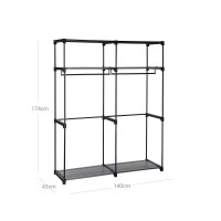 De 0,4 mm tykke bøjlestænger bærer 30 kg hver, mens hver stofhylde kan bære op til 10 kg takket være fire metalrør på 16 mm i diameter og dobbeltsidede forbindere. Samlet maks. belastning er 80 kg – ideelt til alt fra dagligt tøj til sæsonopbevaring.