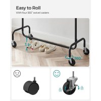 Topstangen kan forlænges fra 110 til 150 cm, og hver ende rækker yderligere 20 cm ud, så der er ekstra plads til tøj og til at hænge tasker, hatte og tørklæder. De fire 360° drejehjul, hvoraf to kan bremses, gør det nemt at flytte stativet rundt og låse det fast, når du har fundet den perfekte placering. Når det ikke er i brug, kan stativet samles og skilles ad i få trin uden værktøj, så det er let at opbevare.